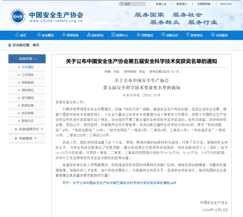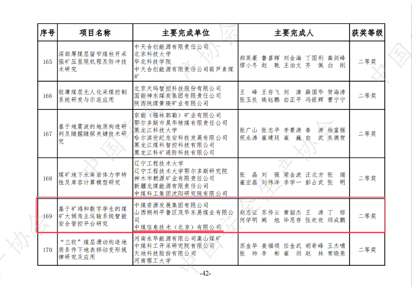 近日,中国安全生产协会发布了《关于公布中国安全生产协会第五届安全科学技术奖获奖名单的通知》,中煤信息公司承建的《基于矿鸿和数字孪生的煤矿大倾角主运输系统智能安全管控平台研究》荣获科技进步二等奖。